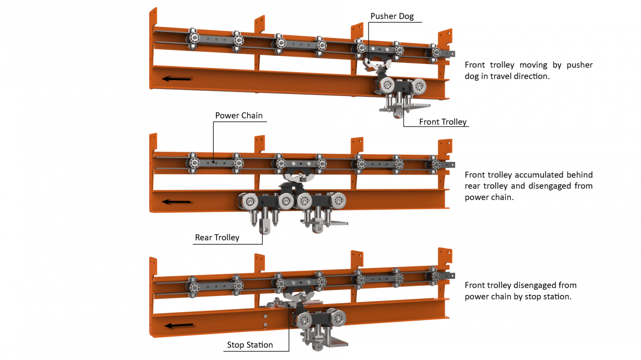 Stop stations (available as standard, ATEX or high-temperature design for curing ovens), are controlled and monitored by the main control system of the conveyor. They are used to disengage the link between the power chain and trolleys. When a stop station is closed the carrier will stop while the power chain keeps moving. The pusher dog and trolley design also allow for multiple carriers to buffer behind a stop station.