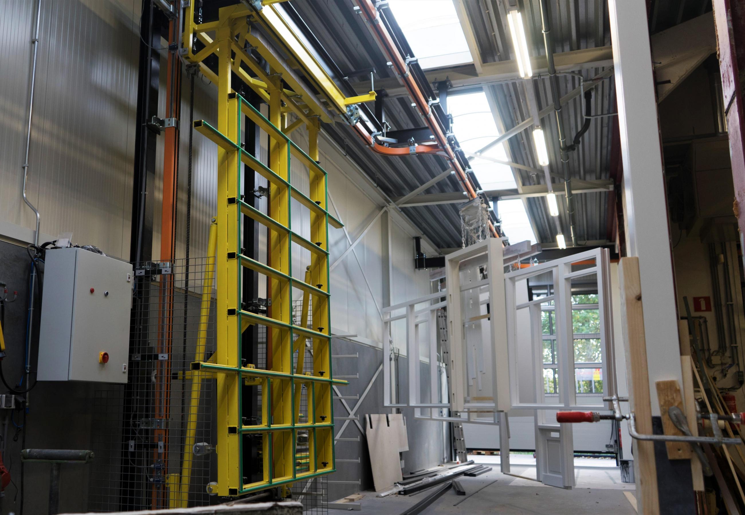 Here is how the Tilting Unit (Afmontage Unit) can be used as a part of a monorail overhead conveyor. This particular installation at a timber factory uses it to finish assembling the plinths onto a door frame after it has been spray painted.